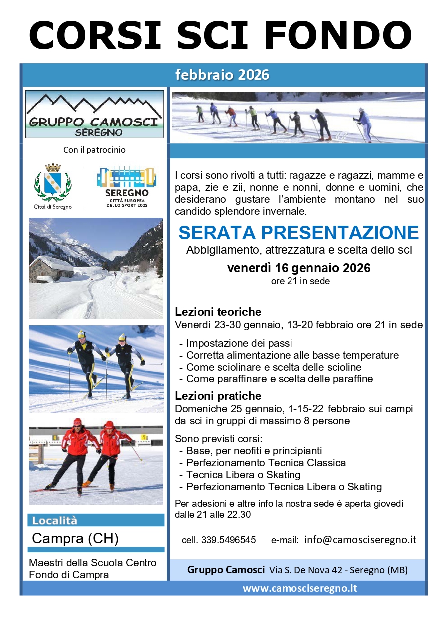 - Il corso comprende: 8 ore di lezioni pratiche sulla neve, 4 lezioni teoriche, il materiale didattico e di gruppo ( fascicoli, scioline, solventi e paraffine ), la copertura assicurativa, l'ingresso alle piste di sci
